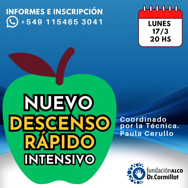 Consta de 8 reuniones, la modalidad es por Zoom y se trabaja con un tema diario para bajar de peso. Se realiza un plan muy estricto en créditos/calorías (20 créditos o 1000 kcal.) específico (Plan de Descenso Rápido), con equivalencia de porciones y menúes semanales. No incluye literatura de apoyo, por lo tanto se debe adquirir el “Pasaporte” y “Plan de Descenso Rápido”.
